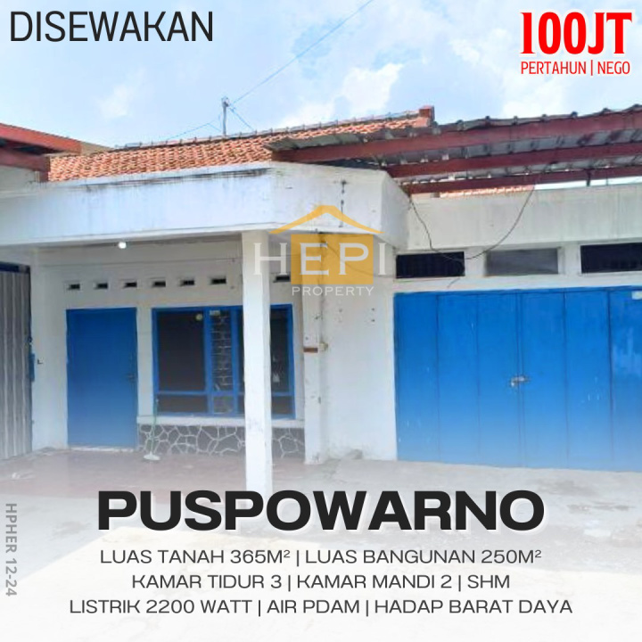 Rumah disewakan murah di Puspowarno, Semarang. Luas tanah 365m², LB 250m², 3 kamar tidur, 2 kamar mandi. Harga sewa hemat: 100 Juta /tahun. Cocok untuk keluarga kecil.