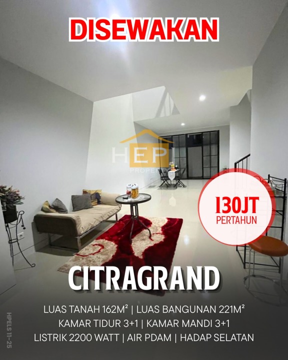 Rumah disewakan murah di Citragrand, Semarang. Luas tanah 162m², LB 221m², 3 kamar tidur, 3 kamar mandi. Harga sewa hemat: 130 Juta /tahun. Cocok untuk keluarga kecil.