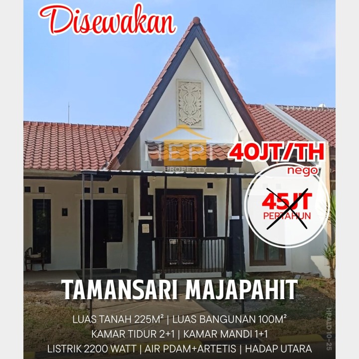 Rumah disewakan murah di Majapahit, Semarang. Luas tanah 225m², LB 100m², 3 kamar tidur, 2 kamar mandi. Harga sewa hemat: 40 Juta /tahun. Cocok untuk keluarga kecil.
