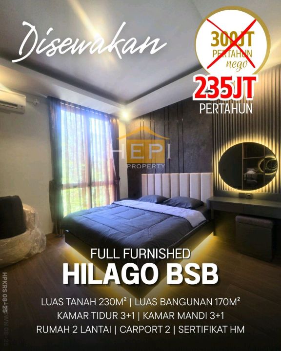 Rumah kontrakan murah di BSB City, Semarang. Luas tanah 230m², luas bangunan 170m², 3 kamar tidur & 3 kamar mandi. Harga sewa hemat: 235 Juta /tahun. Lokasi strategis.