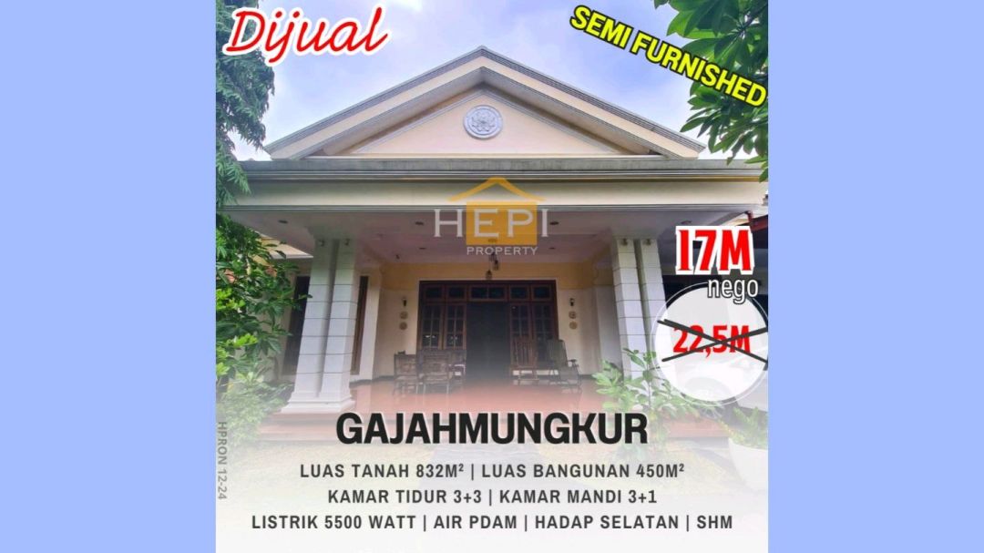 Tersedia rumah eksklusif di kawasan elit Gajah Mungkur, Semarang. Dengan desain modern, LT 832m², LB 450m², terdiri dari 3 KT & 3 KM. Harga premium: 17 Miliar. Lingkungan prestisius.