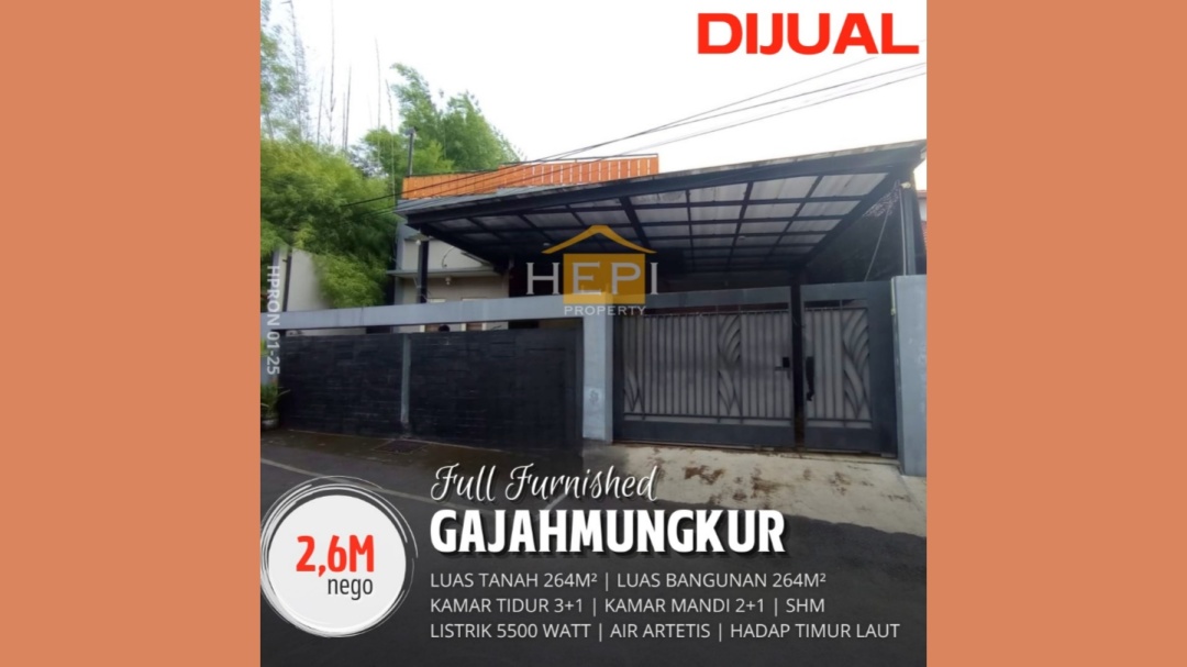 Kesempatan emas memiliki rumah elit di Gajah Mungkur, Semarang. Luas tanah 264m², bangunan 264m², 3 KT & 2 KM. Harga terbaik di kelasnya: 2,6 Miliar. Dekat pusat kota dan fasilitas premium.