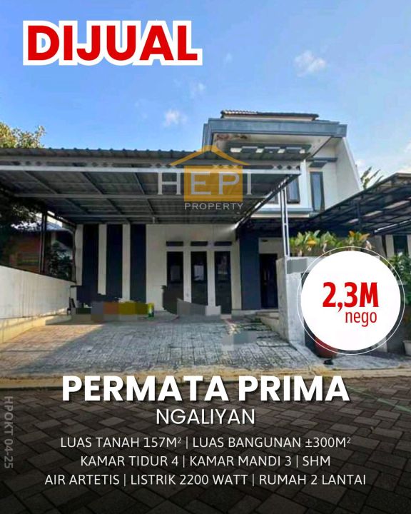 Promo terbatas rumah keluarga di Ngaliyan, Semarang. Luas tanah 157m² dengan bangunan 300m², terdiri dari 4 KT & 3 KM. Harga terbaik di kelasnya: 2,3 Miliar. Lingkungan nyaman.