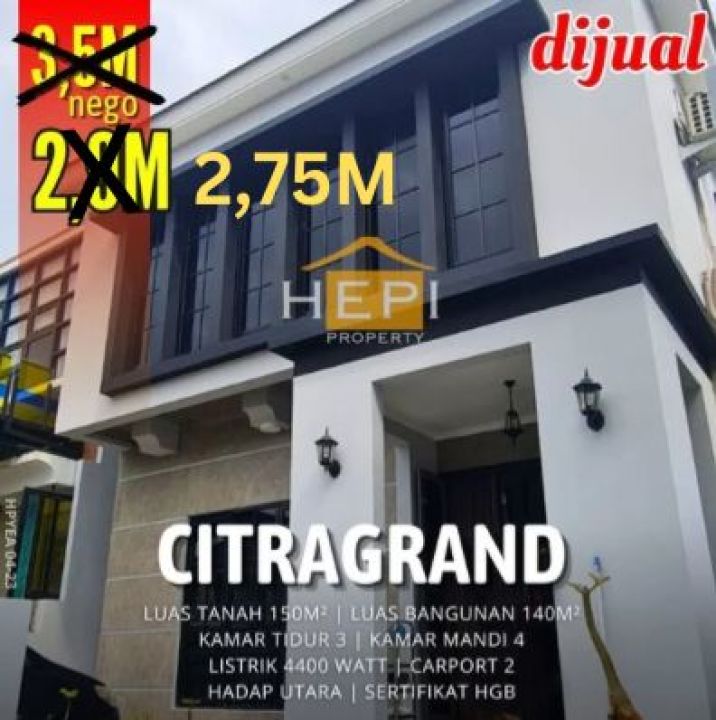 Hunian mewah di Citragrand, Semarang. Memiliki luas tanah 150m² dengan bangunan 140m², terdiri dari 3 kamar tidur & 4 kamar mandi. Harga eksklusif: 2,75 Miliar. Lingkungan privat.