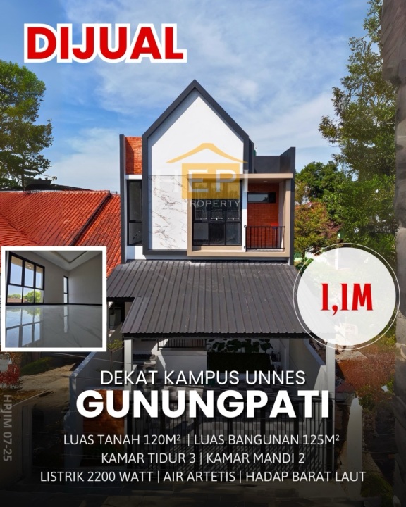 Rumah keluarga di lokasi strategis Gunung Pati, Semarang. Punya 3 KT dan 2 KM, LT 120m², LB 125m². Harga terbaik 1,1 Miliar. Dekat fasilitas umum.