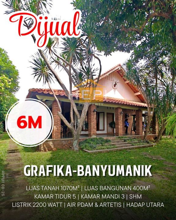 Hunian berkelas di Banyumanik, Semarang. Memiliki luas tanah 1070m² dengan bangunan 400m², terdiri dari 5 kamar tidur & 3 kamar mandi. Harga eksklusif: 6 Miliar. Lingkungan privat.