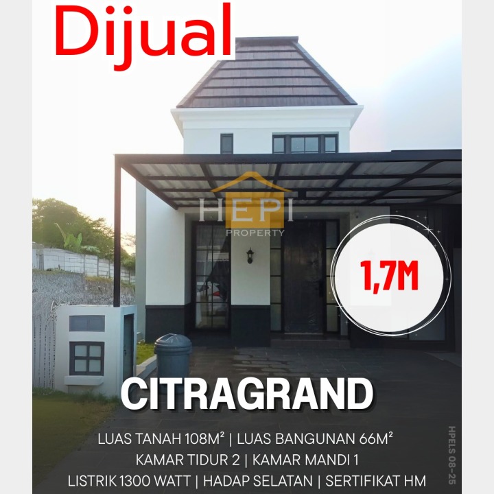 Rumah minimalis di kawasan Citragrand, Semarang. Luas tanah 108m² dan luas bangunan 66m², dilengkapi 2 KT & 1 KM. Harga mulai 1,7 Miliar. Proses pembelian mudah.