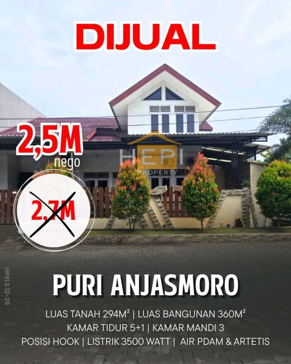 Miliki rumah di Puri Anjasmoro, Semarang. Memiliki 5 kamar tidur, 3 kamar mandi, luas tanah 294m², luas bangunan 360m². Harga spesial: 2,5 Miliar. Lingkungan nyaman.