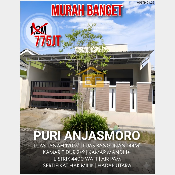 Dijual rumah di Puri Anjasmoro, Semarang. Hunian nyaman dengan 2 kamar tidur dan 1 kamar mandi. LT 120m², LB 144m². Harga kompetitif 775 Juta. Lokasi strategis.