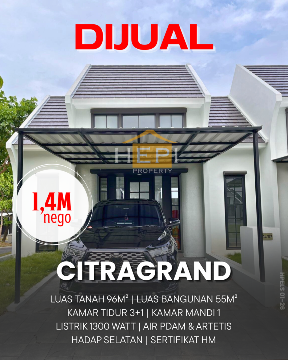 Promo terbatas rumah keluarga di Citragrand, Semarang. Luas tanah 96m² dengan bangunan 55m², terdiri dari 4 KT & 1 KM. Harga terbaik di kelasnya: 1,4 Miliar. Lingkungan asri dan aman.