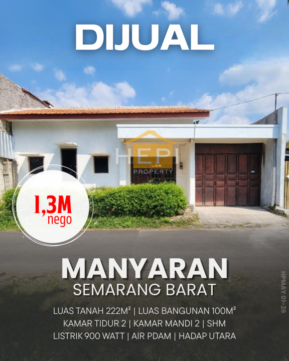 Rumah siap huni di kawasan Manyaran, Semarang. Luas tanah 222m² dan luas bangunan 100m², dilengkapi 2 KT & 2 KM. Harga mulai 1,3 Miliar. Proses cepat.