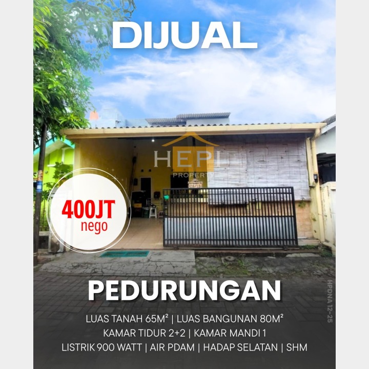 Kesempatan emas! Miliki rumah murah di Pedurungan, Semarang. Bangunan minimalis dengan 2 kamar tidur, 1 kamar mandi, LT 65m², LB 80m². Harga spesial: 400 Juta.