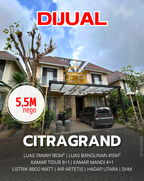 Hunian berkelas di Citragrand, Semarang. Memiliki luas tanah 180m² dengan bangunan 415m², terdiri dari 9 kamar tidur & 5 kamar mandi. Harga eksklusif: 5,5 Miliar. Lingkungan privat.