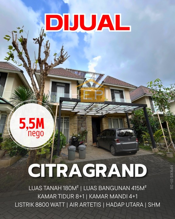 Tersedia rumah eksklusif di kawasan elit Citragrand, Semarang. Dengan desain modern, LT 180m², LB 415m², terdiri dari 8 KT & 4 KM. Harga premium: 5,5 Miliar. Lingkungan prestisius.
