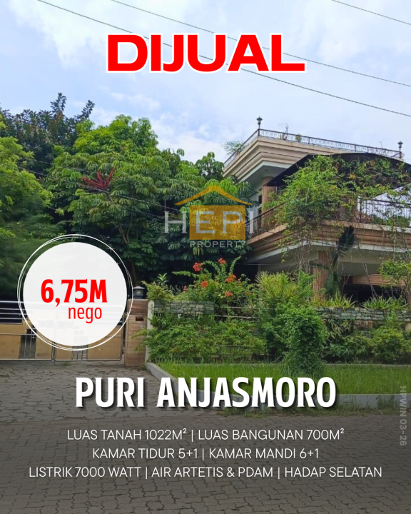 Rumah luxury siap huni di Puri Anjasmoro, Semarang. Hunian elit dengan 6 kamar tidur dan 7 kamar mandi, LT 1022m², LB 700m². Harga eksklusif: 6,75 Miliar. Fasilitas lengkap.