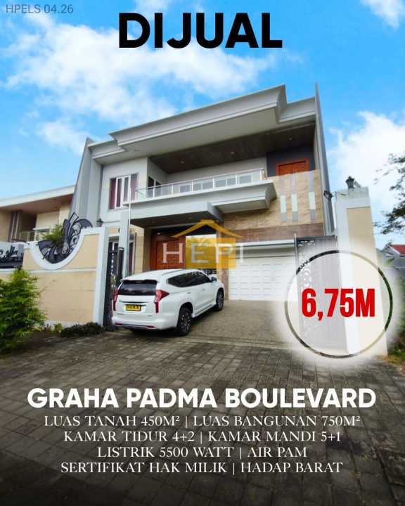 Hunian berkelas di Graha Padma, Semarang. Memiliki luas tanah 450m² dengan bangunan 750m², terdiri dari 6 kamar tidur & 6 kamar mandi. Harga eksklusif: 6,75 Miliar. Lingkungan privat.