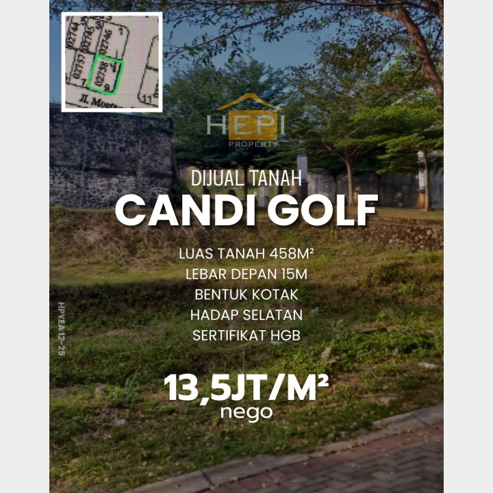 Dijual tanah eksklusif di kawasan elit Candi Golf, Semarang. Luas tanah 458m², harga premium 6,18 Miliar. Cocok untuk hunian mewah atau investasi prestisius.