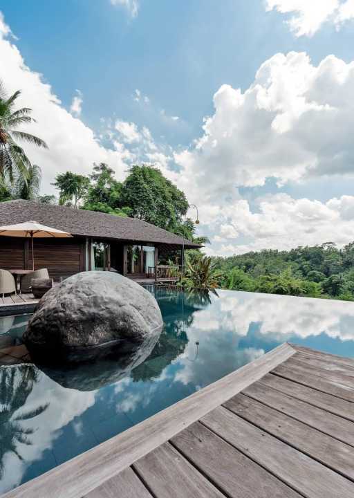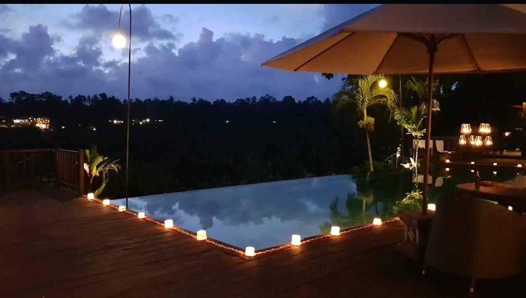 Kolam infinity 15 meter dengan pemandangan Sayan Ridge.